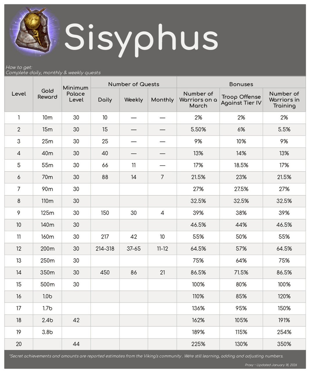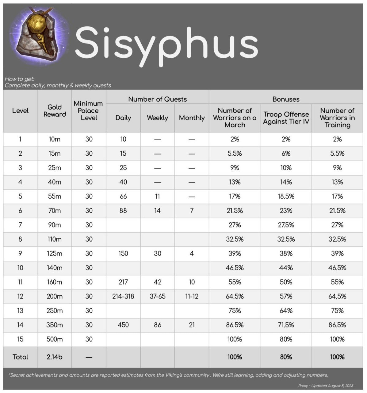 | Minimum level of the Palace | 30 | 30 | 30 | 30 | 30 | 30 | 30 | 30 | 30 | 30 | 30 | 30 | 30 | 30 | 30 | |