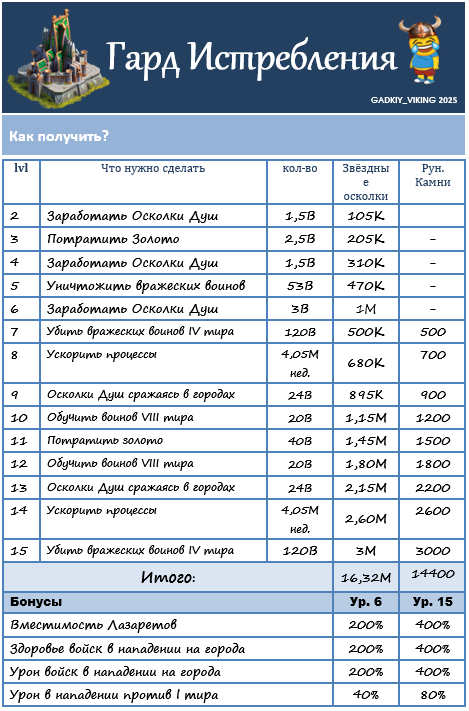 | Уровень | Потратить Золото | Заработать Осколки душ | Уничтожить вражеских воинов | Звездный осколок | Приобрести в Сезонном магазине | |||||