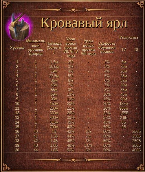 | Урон войск против VII тира | 2% | 3% | 4% | 5% | 6% | 7% | 8% | 10% | 13% | 20% | 22% | 26% | 30% | 35% | 40% | 40% |